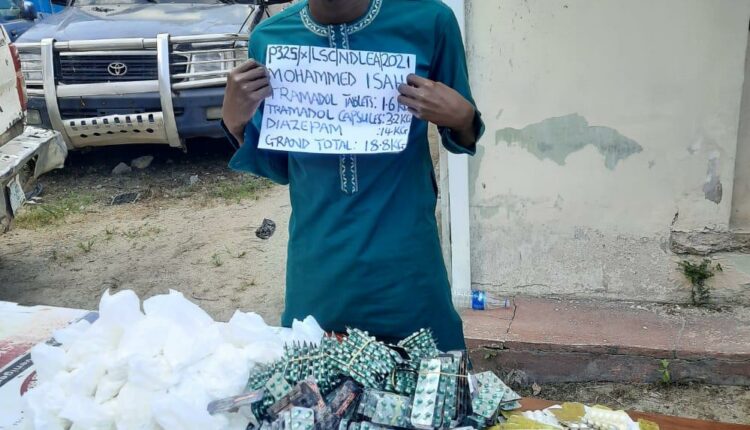 Babafemi said a 25-year-old Mohammed Isah, recruited to move the drugs from Lagos to Borno was arrested on Tuesday 1st June, 2021 at SD Motors park, Agege, Lagos with 12,390 capsules of Tramadol weighing 4.8 kilogrammes and 22,560 tablets of Diazepam with a total weight of 14 kilogrammes, both weights totaling 18.8 kilogrammes.