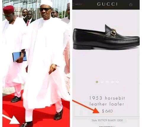“The issue is not the shoe you wear on your leg. The issue is where your leg takes you. Bambiala Buhari wears $640 @Gucci to go and beg for loans from countries whose Presidents wear $100 shoes. What is in your head is always more important than what is on your leg.